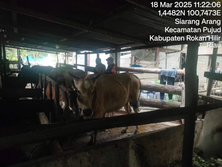 Sekaligus pemantauan dan pengecekan kesehatan hewan ternak milik warga sebagai antisipasi wabah penyakit mulut dan kuku (PMK)dengan menyambangi kandang sapi Di Kepenghuluan Siarang Arang Kecamatan Pujuf Kabupaten Rokan Hilir Riau. Pada Selasa (18/03/2025).