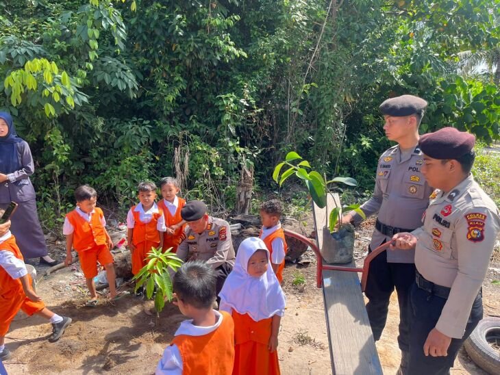 Green Policing di Rohil, Sat Samapta Polres Rohil Ajak Anak TK Mutiara Sari Rawat Bumi Lewat Gerakan Menanam Pohon